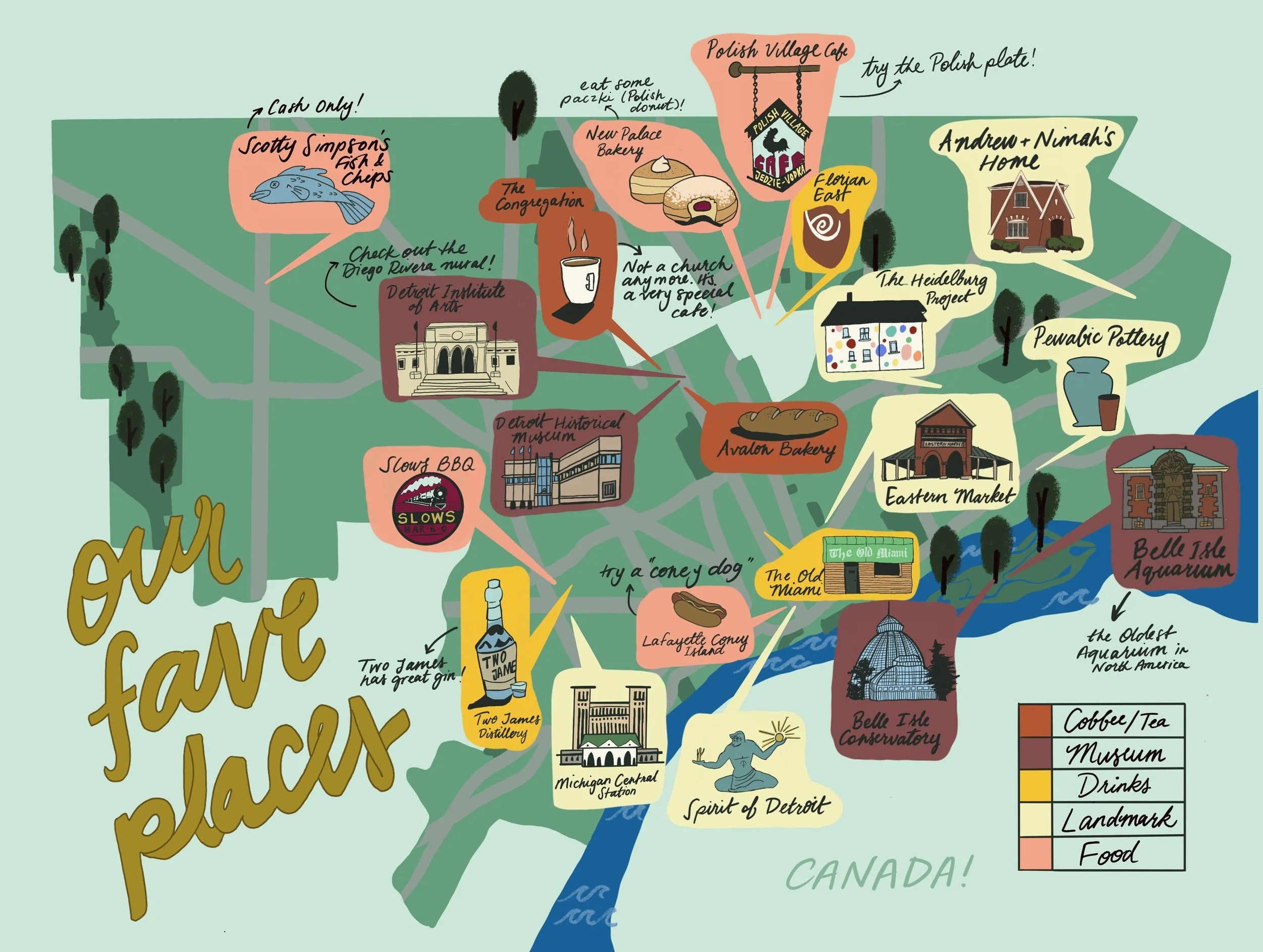 If you’re able, we’d love for you to make a whole experience out of your time in Detroit. We’ve made an illustrated map with some of our favorite places to help you get around. There will be copies available to download, and we hope to place physical copies at the hotels when you arrive as well. Don’t worry if you can’t do it all -- you’ll have a reason to come back once you fall in love with the city.